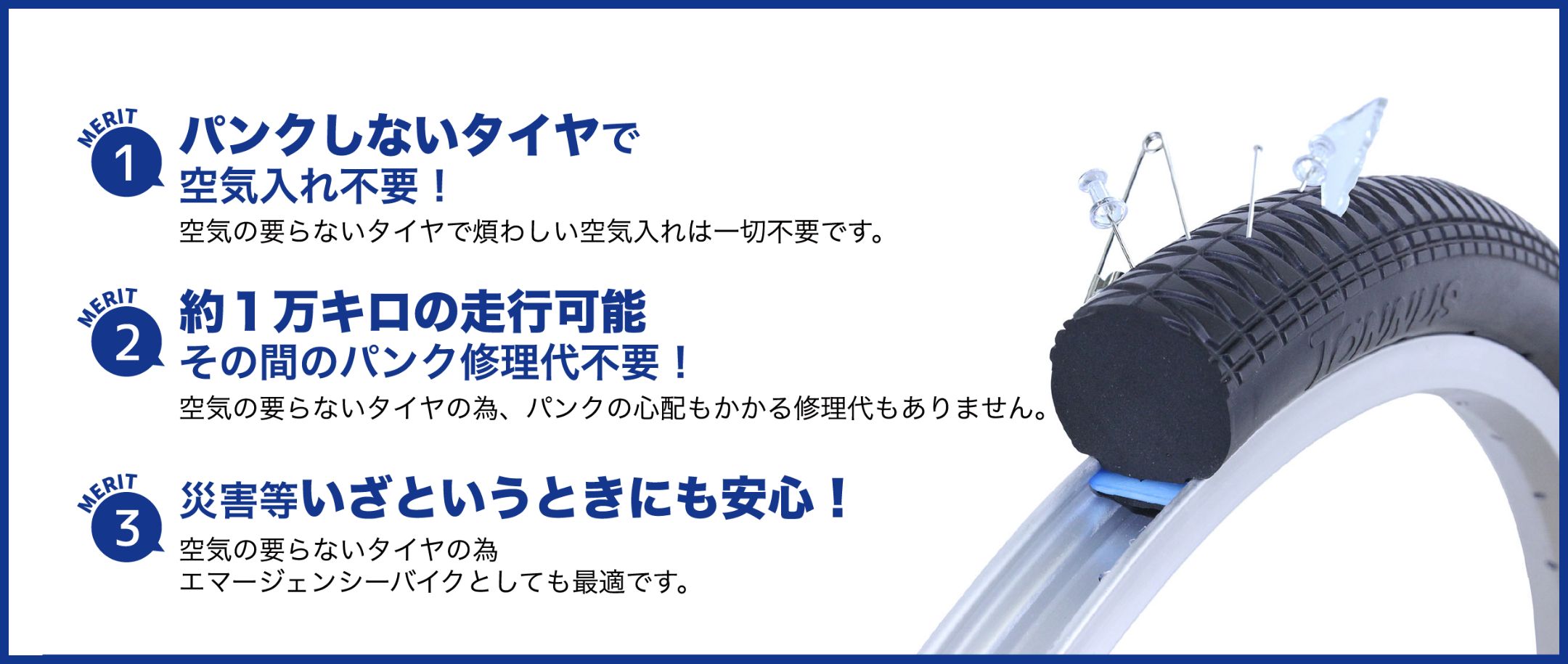 エアレスタイヤはわずらわしい空気入れの作業が不要で、いつ乗っても空気を入れたばかりの“パンパン”の状態が保たれますので「変わらない乗り心地」「変わらない走行性」を実現します。