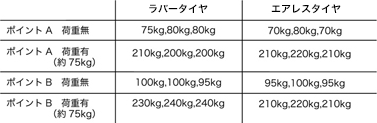 それぞれの自転車で荷重無しと荷重有り、横に引く箇所を変更して測定した。測定に関してはバネばかりで動き出したところの数値を用いた。